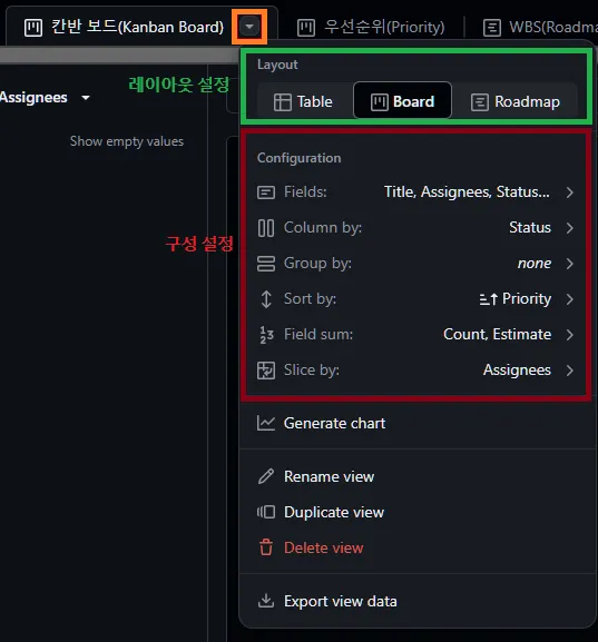 해당 View에서 내림 표시 버튼을 누르면 View 설정을 할 수 있다.