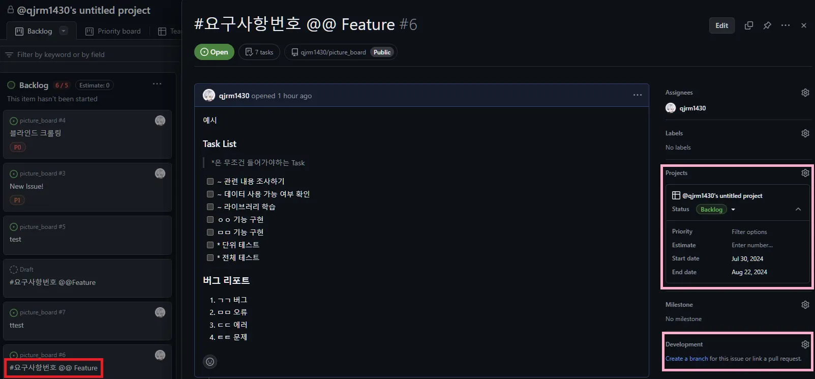해당 이슈를 클릭한 후 Project 설정 및 Development에서 Branch연결