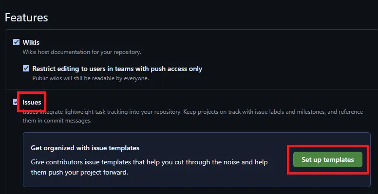 Features 카테고리의 Issues에서 Set up templates를 클릭한다.