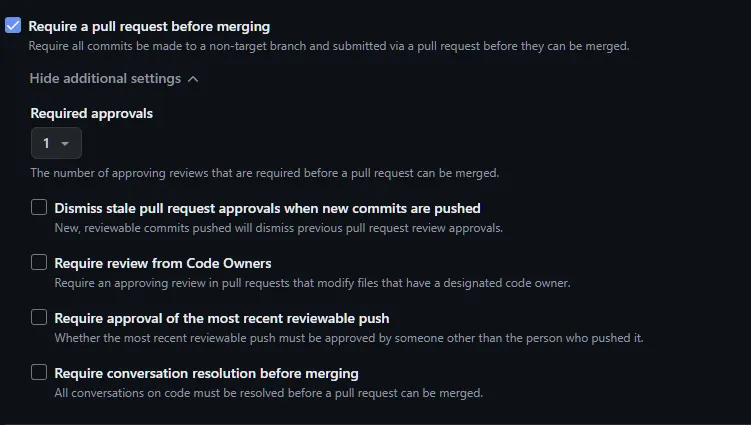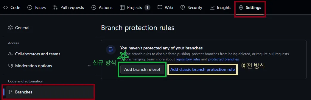 규칙을 지정하는 방식으론 총 두 가지가 있는데 필자는 기존방식과는 다른 새로운 branch ruleset 방식을 사용하였다.