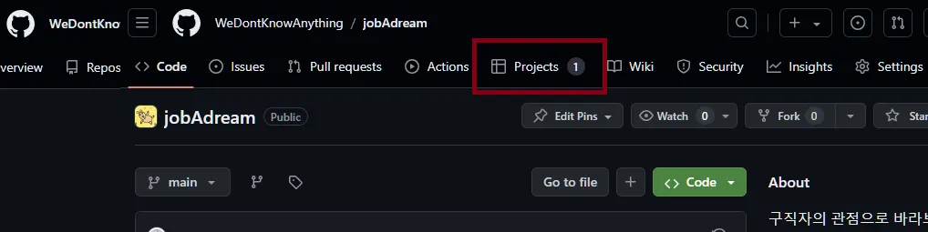 Github Project 생성을 원하는 레포지토리에 접속후 Projects 탭 클릭