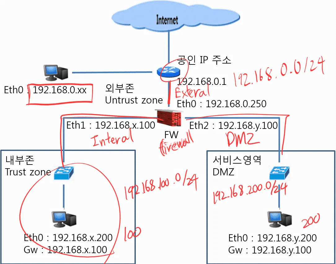 내부 웹서버 (192.168.y.200)와 DNS서버(192.168.y.222)는 내부 및 외부에서 접속할 수 있어야 한다.