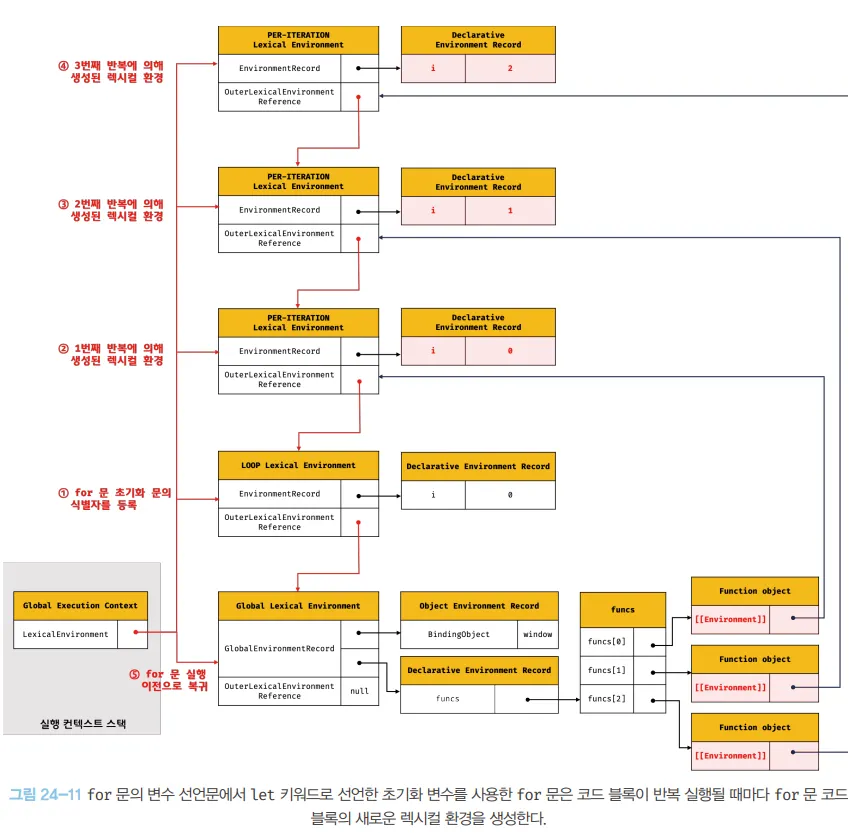 let 키워드 사용 시 for 문의 코드 블록이 반복 실행 될 때마다 for문 코드 블록의 새로운 렉시컬 환경이 생성
