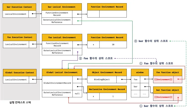 스코프 체인 : 렉시컬 환경의 '외부 렉시컬 환경에 대한 참조'를 통해 상위 렉시컬 환경과 연결