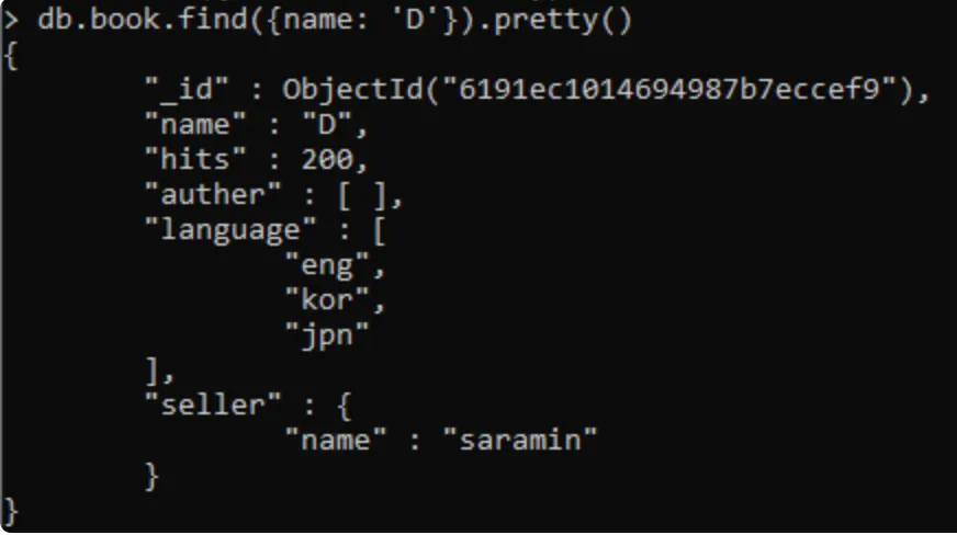 { "_id" : ObjectId("56c0ab6c639be5292edab0c4"), "title" : "article01", "content" : "content01", "writer" : "Velopert", "likes" : 0, "comments" : [ ] }