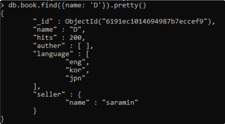 { "_id" : ObjectId("56c0ab6c639be5292edab0c4"), "title" : "article01", "content" : "content01", "writer" : "Velopert", "likes" : 0, "comments" : [ ]
