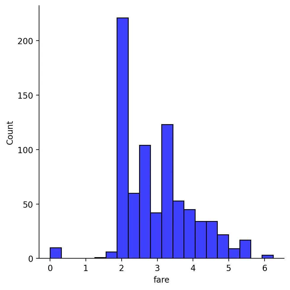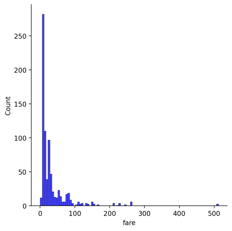 sns.displot(df["fare"], color="b", label="Skewness : %.2f"%(df["fare"].skew()))