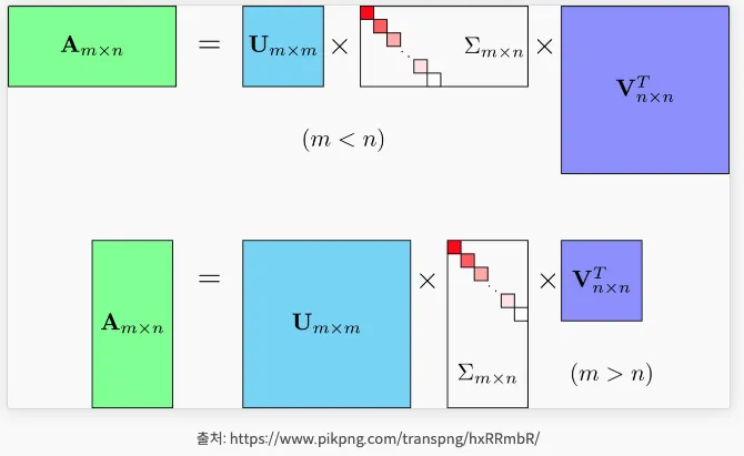 m x n 크기의 행렬 A는 m x m 크기의 형렬 U와 m x n 크기의 (합) 그리고 n x n 크기의(행렬 V의 전치행렬)로 나뉜다.