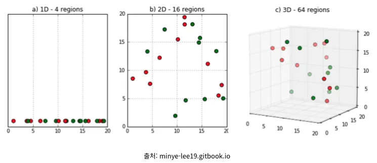 상기 이미지와 같이 데이터양은 동일하지만 차원만 늘어나면 빈공간이 많아지는 것을 볼 수 있다.