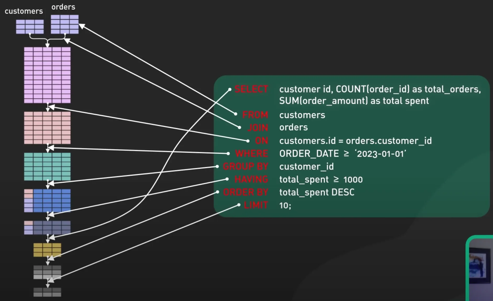 SELECT -> FROM -> WHERE 순으로 작성하는 것이 아니라 FROM -> WHERE -> SELECT 순으로 작성하는 것이다.