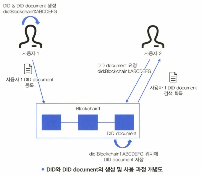 사용자 1이 DID와 DID document 생성 후, DID document는 DID method에 명시된 저장소에 저장 (DID document에는 ID인증 수단에 사용되는 데이터 포함