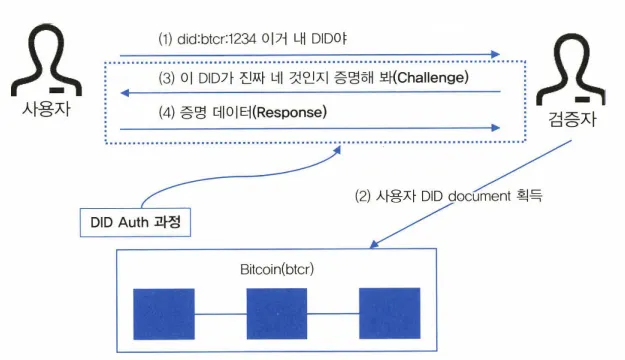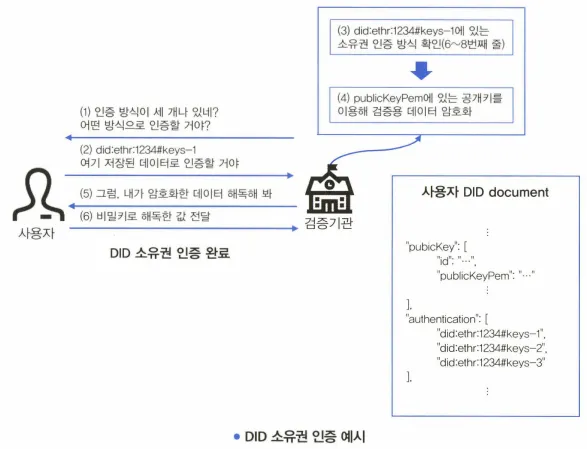 사용자 DID document를 획득한 검증기관 : authentication 항목 확인 → 사용자가 소유권 주장할 수 있는 방식 3가지 인거 확인 → 사용자에게 인증방식 물어봄