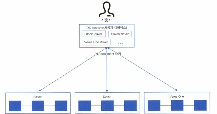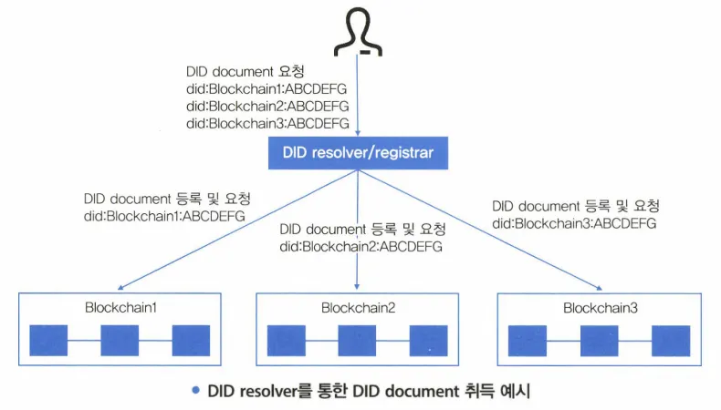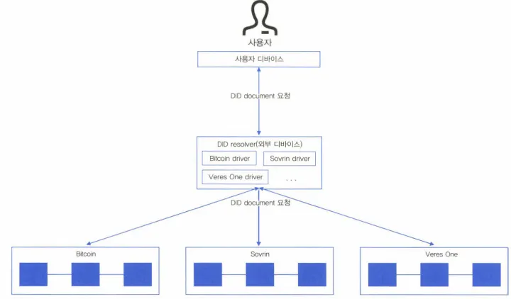 요청을 받은 외부 DID resolver가 실제 블록체인에게 DID document를 요청하고 수신 받은 후 사용자에게 전달