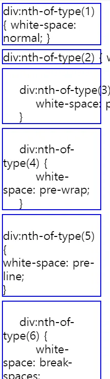 pre-wrap | ==pre , 텍스트 안에 긴 행이 있을 때 해당 행에서 자동 줄바꿈 |